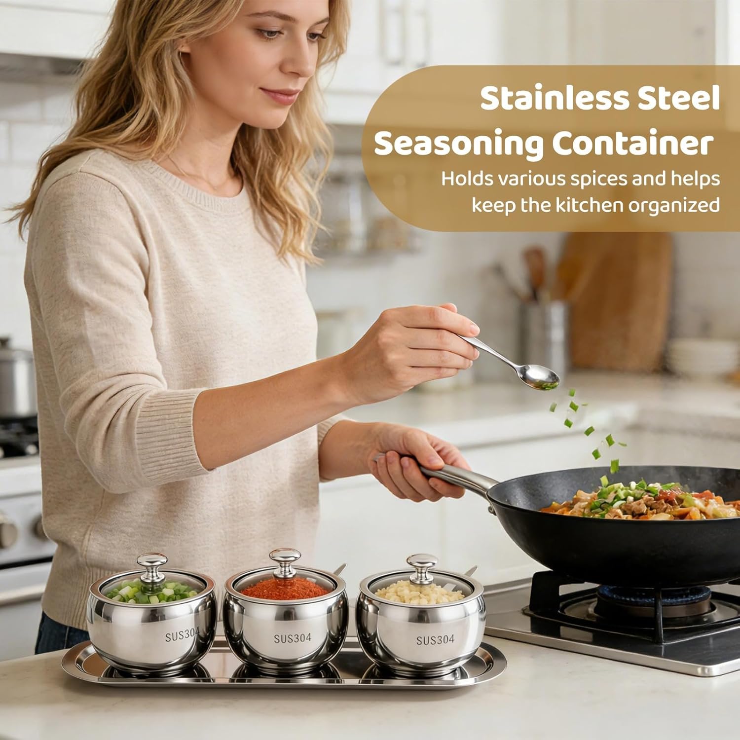 Color: SilverMaterial: Stainless SteelSize: Tray: 29 x 10 cm / 11.42 x 3.94 in, Seasoning Box: 8 x 6.5 cm / 3.15 x 2.56 in, Spoon: 10.5 cm / 4.13 inPackage Includes: 3 x Seasoning Boxes with 3 spoons, 1 x TrayNote:- Please refer to the measurement. Tiny measuring error is allowable in normal range.- There might be a little color difference due to the monitor, camera or other factors, please refer to the physical item.