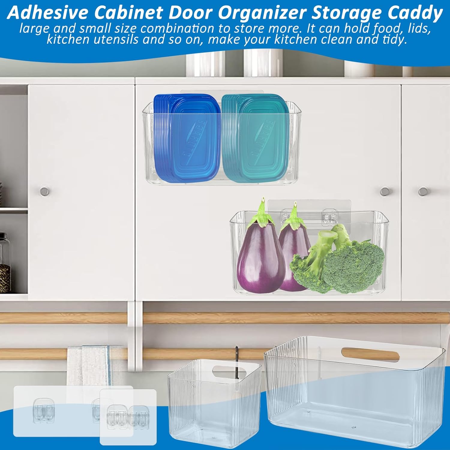 4 Pcs Cabinet Door Organizer Adhesive Mount Kitchen Organizer Container-2 SizeAre you frastrated with small limited space in the Kitchen, Bathroom. Pantry, Office or Under the Sink?Are you annoyed with the mess-up for the small things of the inside the cabinet?Our kitchen cabinet door organizer will help you to say goodbye to clutter and enjoy a neat and organized kitchen.It's perfect for kitchen cabinets, pantry doors, and other cabinet doors. Additionally, it is also suitable for living rooms, offices, bedrooms, bathrooms, RVs, campers and so on.Specifications:Material: PET materialSize: as picture shownColor: ClearPackage included: 4 Pcs Kitchen Cabinet Door Organizer