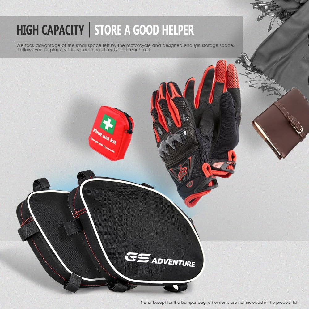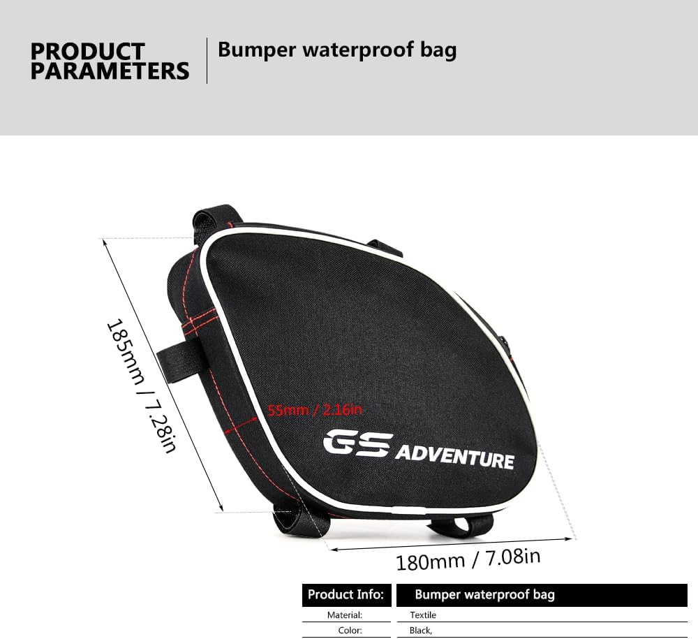 Application: These crash bar bags are specifically designed for R1200GS and Adventure models from 2005 to 2012. They attach to the original protective bars, providing quick access to essentials during rides. Function: Offering additional storage, these bags are easily attached with Velcro fasteners, ensuring they withstand heavy loads while being removable when needed. They complement other soft luggage options for the GS. Material: The bags are crafted with robust, waterproof tarpaulin inserts and certified Cordura fabric, known for its use in motorcycle gear. The fabric's interior is waterproof-coated, and it features a fluorocarbon impregnation and Teflon nano-tech coating for protection against the elements. Appearance: With a refreshing design, the bags showcase an exclusive mix of materials. They are lightweight with a high payload and large usable volume, featuring waterproof, high-quality zippers. Product Includes: The set includes one pair of crash bar bags (left and right) for secure attachment to R1200GS/Adventure, with a non-slip, soft base plate to protect the vehicle's paint and ensure a stable grip. Product list: left and right (1 pair) Applicable Model: For R1200GS 2005-2012 For R1200GS Adventure 2005-2012