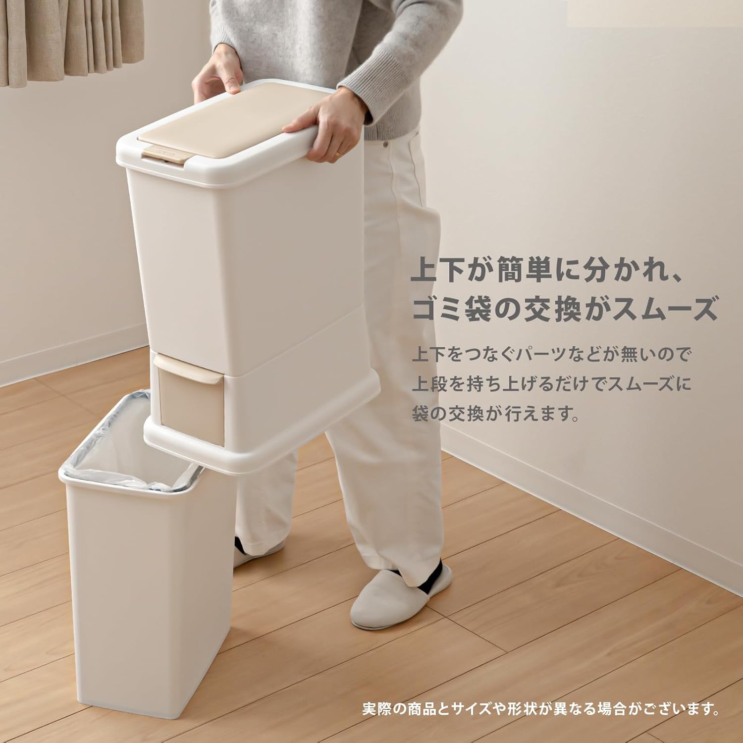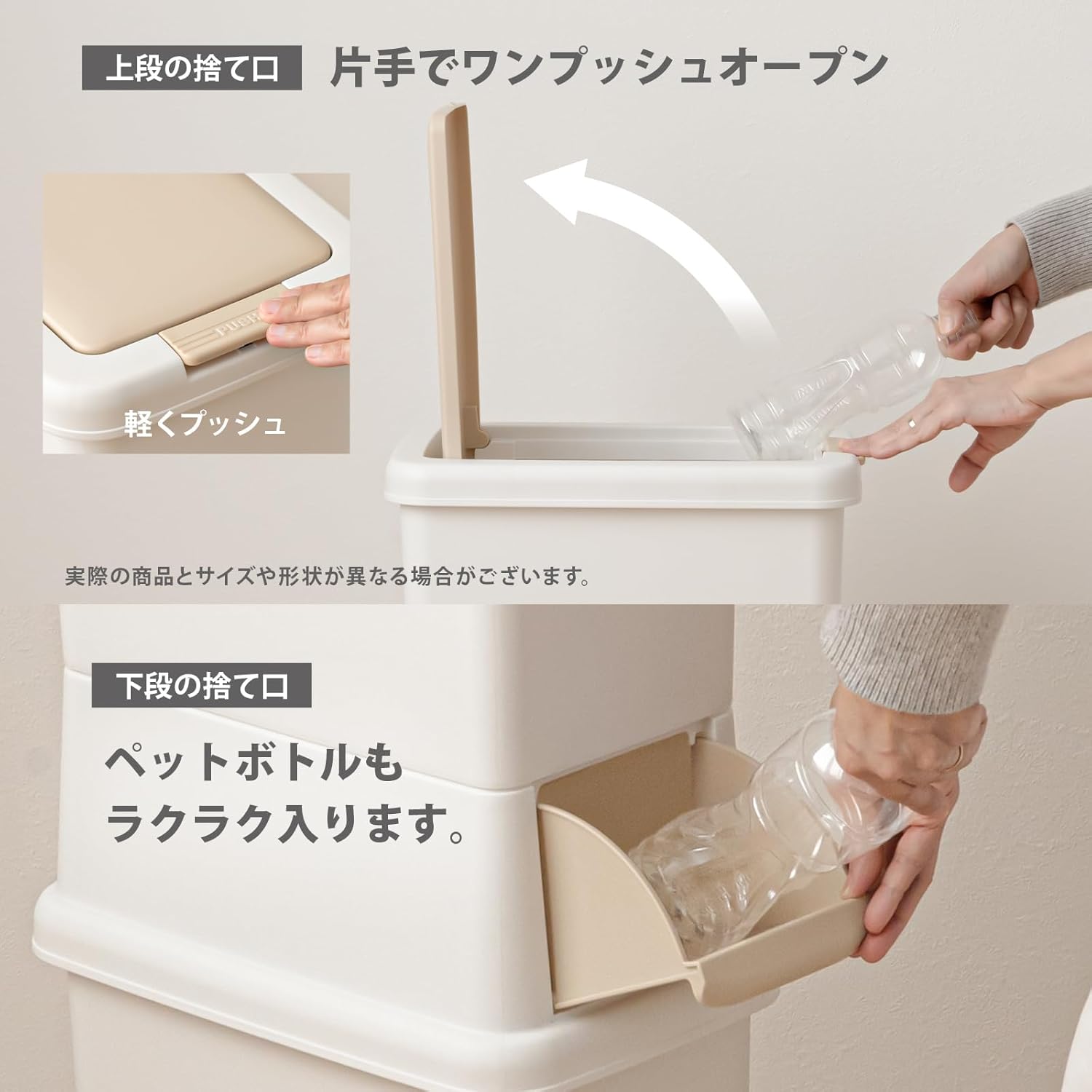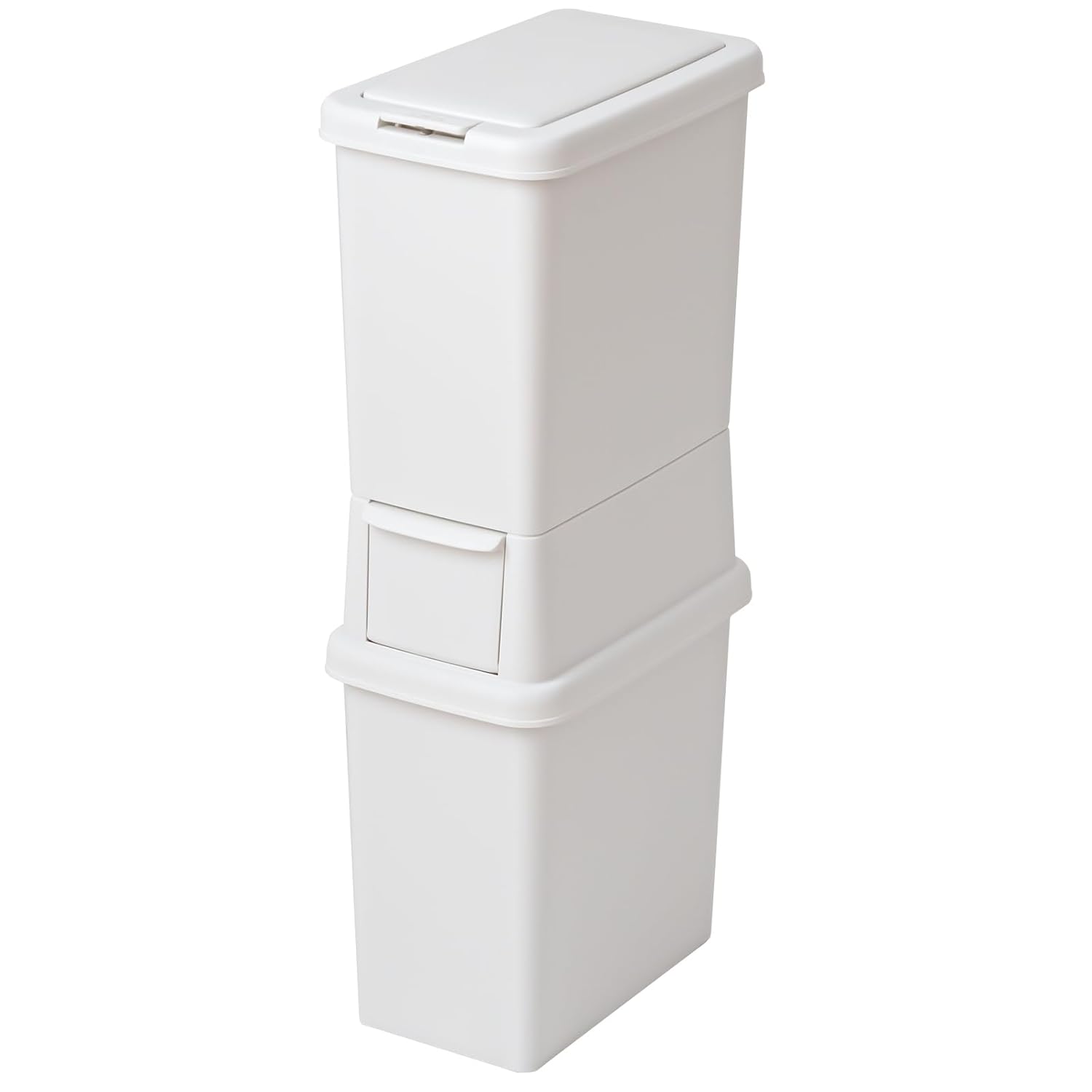 - Space saving dust box that can be stacked and separated ■ The upper level can be opened and closed with a push of a button, and the lower tier is a front opening. ■ Comes with a plastic bag holding that makes it easy to install the bag. - Made in Japan for peace of mind.