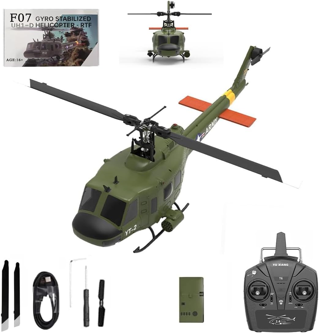 Specifications:.Material: High-strength composite engineering material.Model: F07 UH-1 Huey 6CH 6G Flybarless RC Helicopter Model.Rotor Diameter: 372mm.Fuselage Length: 350mm.Height: 122mm.Weight: Single aircraft weight 228g.Drive Motor: 2511 1200KV brushless motor.Tail lock Motor: 1204 5500KV brushless motor.Servo: 4.3g metal digital servo.Remote Control: 2.4G remote control.Remote Control Distance: Over 120 meters.Body Battery: LI-POLY smart battery 7.4V (1200MAH) 25C.Charger: USB charger.Charging Time: About 60 minutes.Flight Time: 10-12 minutes.Product Weight: 780g.Package Weight: 1400g.Product Dimensions: 38.5 x 37.5 x 12cm .Package Dimensions: 46 x 29 x 13cm.Packing: Graphic Carton.Ages: 16+Package Including.Aircraft *1.Manual *1.Specialized USB charging cable *1.Main propeller blades *4.Tail propeller blades *1.Smart battery *1/*2/*3/*4